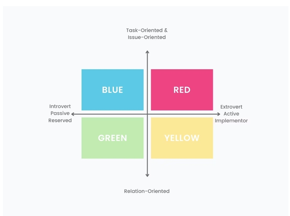 Το κάθε ένα χρώμα αντιστοιχεί σε έναν συγκεκριμένο τύπο συμπεριφοράς, ο οποίος περιγράφει πώς βλέπουν οι άνθρωποι τον εαυτό τους σε σχέση με το περιβάλλον τους.